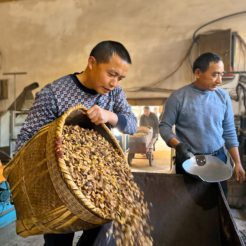 小溪组的山林间,生长着大片野生山茶树。这些山茶树非人工种植,山茶树果实成熟,村民们徒步深入山林,小心翼翼地采摘。采摘后的果实经过晾晒、去壳、压榨等传统工艺,榨取出的山茶油色泽金黄透亮,散发着淡淡的清香。